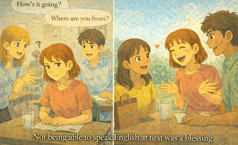 (6) 最初は英語を話せなかったことは災い転じて福となりました。