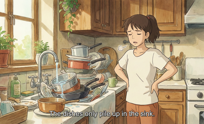 (4) The dishes only pile up in the sink.