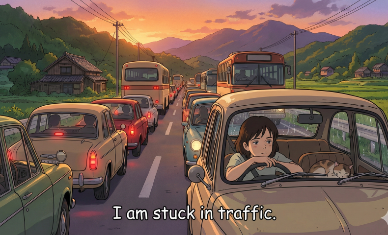 形式: be stuck in + 場所・状況 / be stuck on + 問題・課題・人