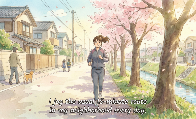 (6) 私は毎日、近所のいつもの15分コースをジョギングします。