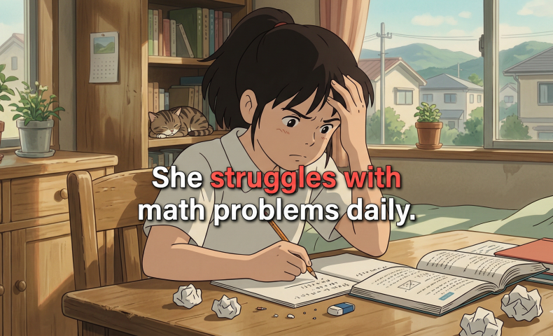 (5) She struggles with math problems daily.
