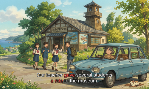 意味:〜を車で送る、乗せてあげる形式:give + 人 + a ride / give + 人 + a ride + to + 場所ポイント:・「〜を車で…