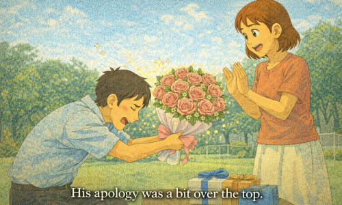 意味:やりすぎの、大げさな、度を越した形式: be動詞 + over the topポイント:程度が極端すぎることを表すカジュアルな表現英文:(1) …