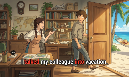 意味:「(人)を説得して~させる」形式:talk + 人 + into + 名詞/動名詞ポイント:・説得して行動させることを表す・「persuade」と…