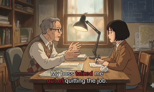 意味:「(人)を説得して~をやめさせる」形式:talk + 人 + out of + 名詞/動名詞ポイント:・説得して行動を思いとどまらせることを表す・…